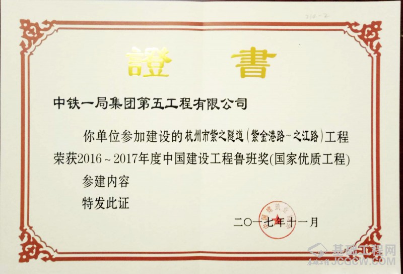 4月22日,中铁一局五公司收到中国土木协会颁发的杭州紫之隧道工程获第十七届中国土木工程詹天佑奖证书。这是紫之隧道项目自2017年获得中国建设工程质量最高荣誉鲁班奖后,再次获得国家土木工程最高荣誉,成为杭州市隧道项目首个获得鲁班奖和詹天佑奖的双奖工程。