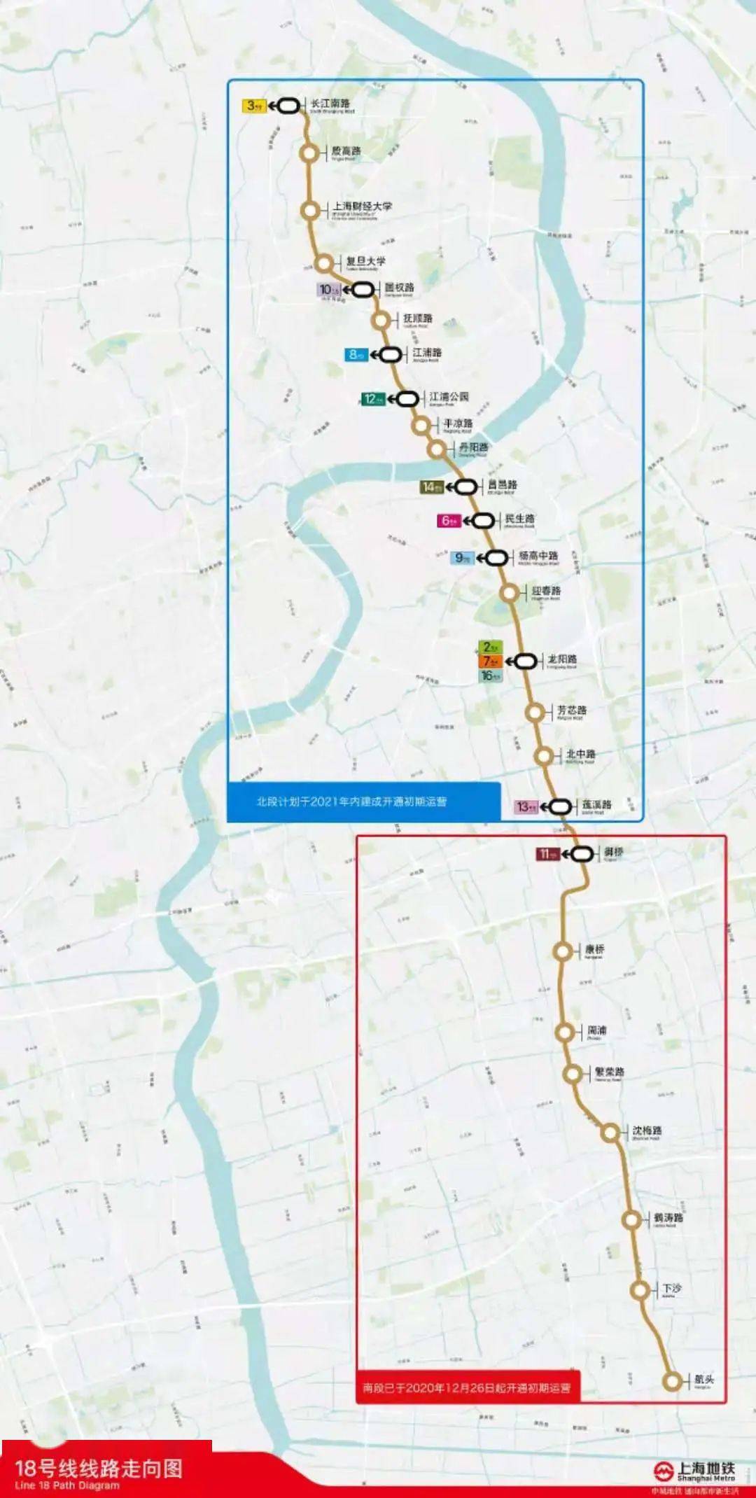 18号线是上海首批全功能一次性开通最高等级全自动无人驾驶系统的地铁线路,途经浦东、杨浦、宝山区,一期全线共设26座车站,全部为地下车站,分为南段和北段。