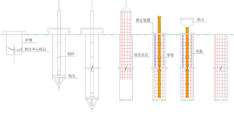 2、钻孔:钻机就位后埋设护筒。开始钻进时,严格控制进尺速度,采取低压慢进措施,待钻至护筒下1m后,以正常速度钻进。钻孔过程须连续作业,中途不得中断。钻进中密切关注土层变化,在土层变化处捞取渣样判断土层,并记录在钻孔记录表中,与地质资料进行核对。当钻孔距设计标高1m时,谨慎控制钻进速度和深度,防止超钻,并核实地质资料,判定是否进入要求的持力层。同时,为减少对周围环境的污染,对沉淀池中沉渣及混凝土灌注时溢出的废弃泥浆,抽走外运,严禁就地排浆或弃渣。