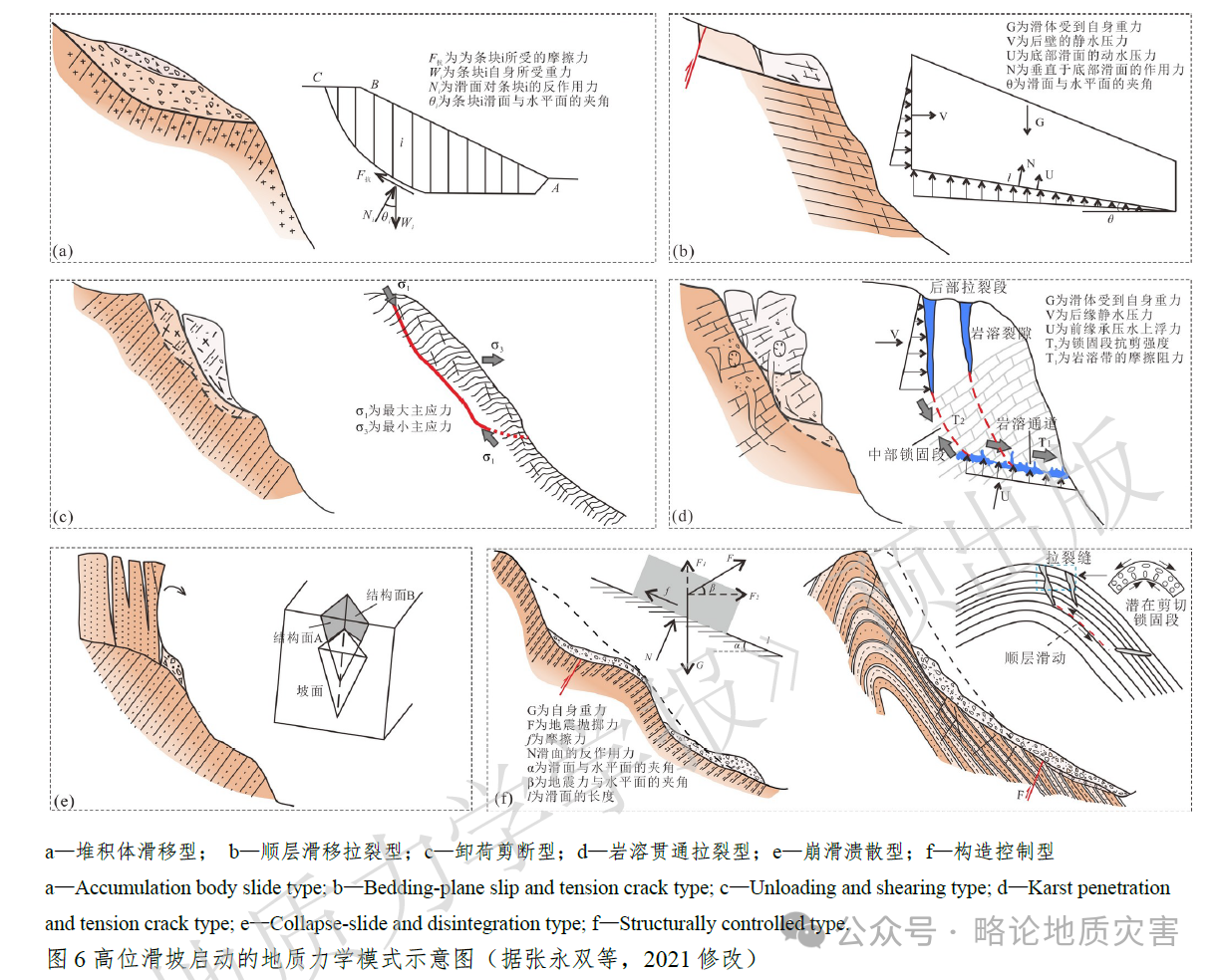 高位滑坡地质力学模式:提出6类控滑模式(如堆积体滑移型、构造控制型),阐明白格滑坡等案例中构造缝合带与蚀变软岩的联合控滑机制。