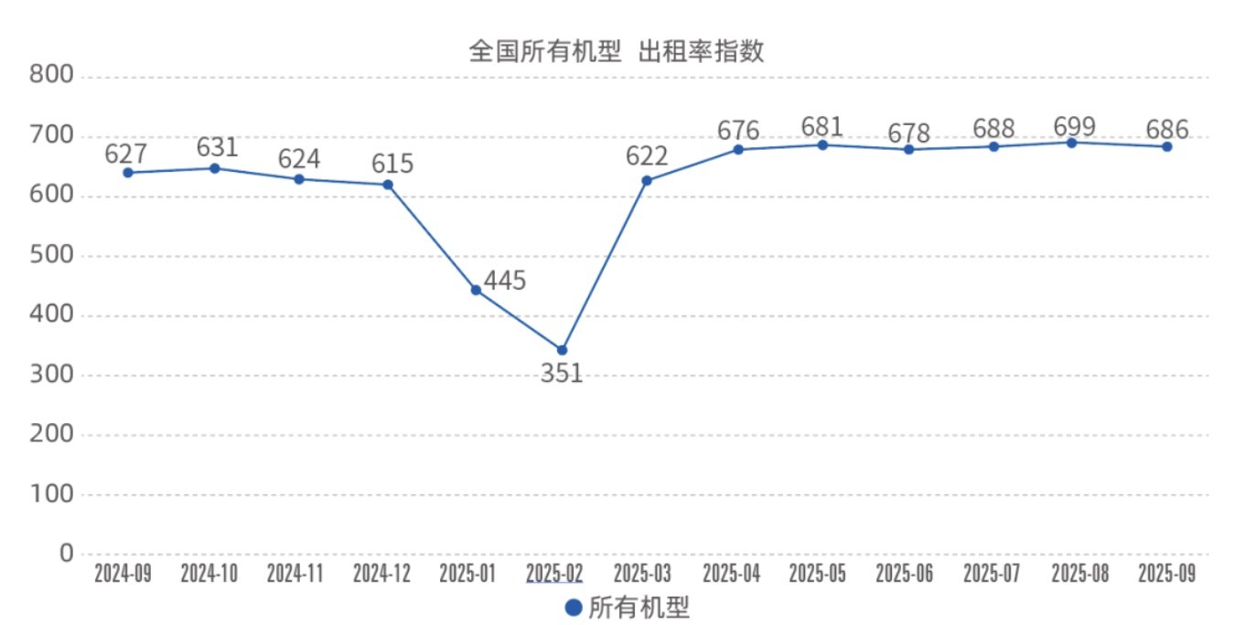 2025年9月升降工作平台出租率指数为686点,环比微降1.9%,同比上涨9.4%。总体看9月份各机型环比出租率指数涨跌各半,其中20~24m机型出租率指数环比涨幅达到5.3%,40m以上机型环比降幅达到11.4%。2025年9月出租率指数同比均处于普涨态势,20~35m机型的涨幅都超过了两位数 ,26~28m机型涨幅达到19.4%,40m以上机型涨幅仅为0.3%,基本处于持平状态。(出租率是以台天数为基准进行计算,100%出租率对应1000点。)