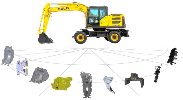 除标准铲斗外,还可选配窄斗、破碎锤、夹木叉、液压剪等多种属具,轻松应对清理、挖掘、破碎、吊装等多种作业场景,真正实现一机多能,最大限度满足客户多样化需求。