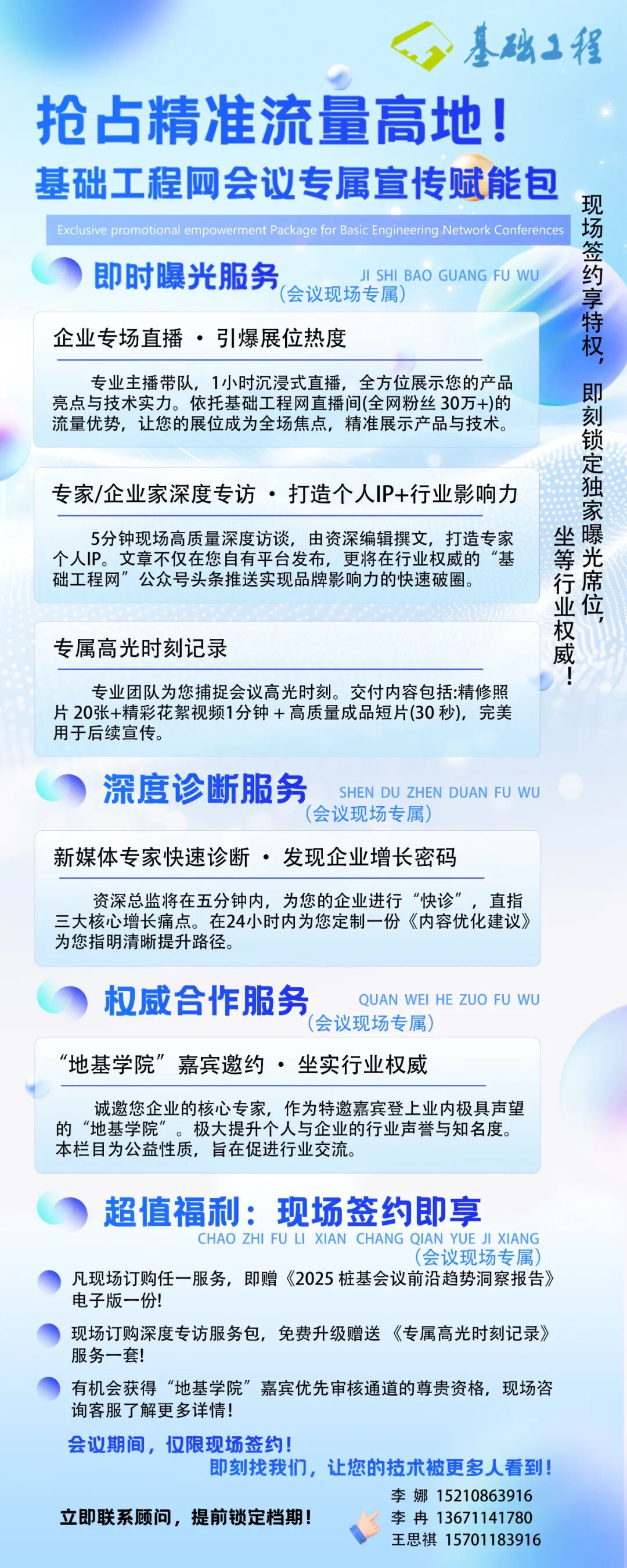 亲爱的企业家和学生们: 想让企业产品成为展会焦点?想快速打造行业权威IP?基础工程网重磅推出会议专属宣传赋能包,精准流量、深度曝光、权威认证一站式搞定,现场签约更有超值福利等你来! 01 即时曝光服务 (会议现场专属) 01 企业专场直播-引爆展位热度 内容:专业主播带队,1小时沉浸式直播,全方位展示您的产品亮点与技术实力。依托基础工程网直播间(全网30万+)的流量优势,让您的展位成为全场焦点,精准展示产品与技术。 平台:基础工程网视频号/抖音直播间(精准粉丝5万+,单条视频观看量10万+,单场直播观看量1万+)。 会议特价:联系客服咨询详情。 02 专家/企业家深度专访-打造个人IP+行业影响力 内容:15分钟现场高质量深度访谈,由资深编辑撰文,打造专家个人IP。 发布:文章不仅在您自有平台发布,更将在行业权威的“基础工程网”公众号头条推送,实现品牌影响力的快速破圈。 会议特价:联系客服咨询详情(根据内容深度定制)。 03 专属高光时刻记录 内容:专业团队为您捕捉会议高光时刻。 交付内容包括:精修照片 20张+精彩花絮视频1分钟 +高质量成品短片(30秒),完美用于后续宣传。 会议特价:联系客服咨询详情。 02 深度诊断服务 (会议现场专属) 新媒体专家快速诊断—发现企业增长密码 内容:我们的资深运营总监将在5分钟内,为您企业的线上线下宣传渠道进行“快诊”,直指3大核心增长痛点。 交付:24小时内您将收到一份定制化的《内容优化建议简报》,为您指明清晰提升路径。 会议体验价:联系客服咨询详情。 03 权威合作服务 (会议现场专属) 01 “老朱讲堂“嘉宾邀约 坐实行业权威 内容:诚邀您企业的核心专家,作为特邀嘉宾登上业内极具声望的“老朱讲堂”。 价值:这是提升个人声望与企业品牌高度的权威平台,是行业内技术实力的认证。极大提升个人与企业的行业声誉与知名度。 备注:本栏目为公益性质,旨在促进行业交流。席位稀缺,需经审核。 04 超值福利:现场签约即享 现场签约即享 凡现场订购任一服务,即赠《2025 桩基会议前沿趋势洞察报告》电子版一份! 现场订购深度专访服务包,免费升级赠送《专属高光时刻记录》服务一套! 有机会获得“地基学院”嘉宾优先审核通道的尊贵资格,现场咨询客服了解更多详情! 客服联系专线: 李 冉,13671141780 李 娜,15210863916 王思祺,15701183916