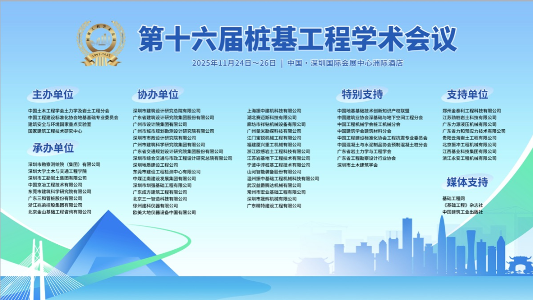 2025年11月25日至26日,第十六届桩基工程学术会议在深圳成功召开。作为我国桩基工程领域规格高、影响广的学术盛会,本次会议以构建高水平、专业化交流平台为宗旨,汇聚了来自产、学、研、用各界的700余位专家、学者与技术人员,围绕智能创新、城市安全与绿色低碳等前沿方向,深入探讨行业发展的新机遇与新挑战。
