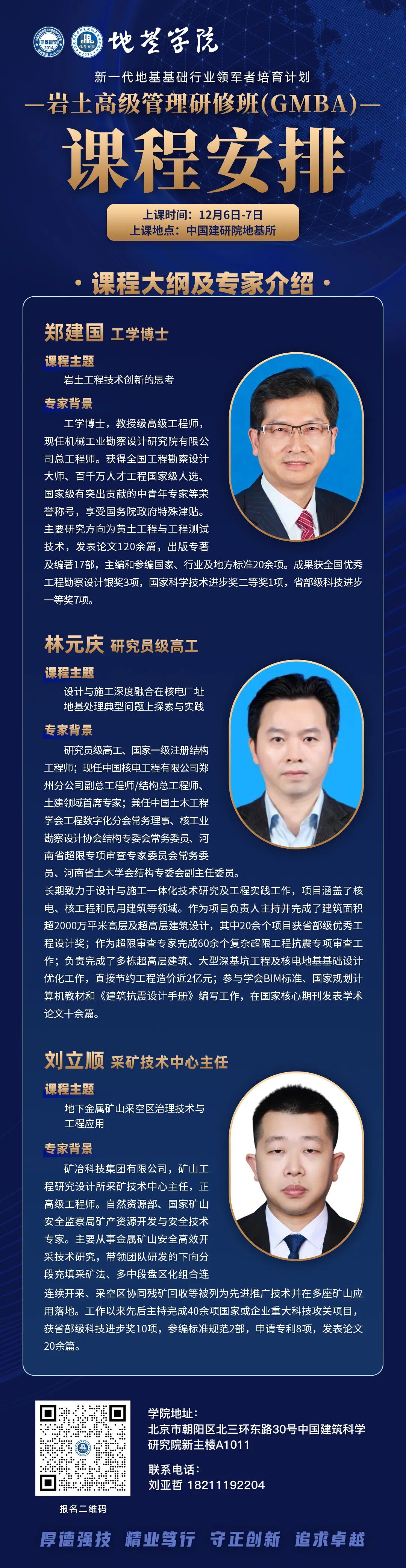 GMBA价值解码 不同于传统MBA课程侧重通用商业逻辑,GMBA(工程管理硕士)课程以“工程实践为核心,商业价值为导向”,构建了独一无二的知识体系。 GMBA课程核心优势在于打破“工程技术”与“商业管理”的壁垒:既涵盖工程经济学、项目全生命周期管理、工程法务与合规等专业模块,又融入战略管理、资本运作、数字化转型等商业内容。帮助管理者在技术可行性与商业合理性之间找到最优平衡点——这正是工程企业高层管理者必备的核心能力。 课程安排 专家天团 01 郑建国——工学博士 课程主题: 岩土工程技术创新的思考 专家背景: 工学博士,教授级高级工程师,现任机械工业勘察设计研究院有限公司总工程师。获得全国工程勘察设计大师、百千万人才工程国家级人选、国家级有突出贡献的中青年专家等荣誉称号,享受国务院政府特殊津贴。 主要研究方向为黄土工程与工程测试技术,发表论文120余篇,出版专著 及编著17部,主编和参编国家、行业及地方标准20余项。成果获全国优秀工程勘察设计银奖3项,国家科学技术进步奖二等奖1项,省部级科技进步一等奖7项。 02 林元庆——研究员级高工 课程主题: 设计与施工深度融合在核电厂址 地基处理典型问题上探索与实践 专家背景: 研究员级高工、国家一级注册结构工程师;现任中国核电工程有限公司郑州分公司副总工程师/结构总工程师、土建领域首席专家;兼任中国土木工程学会工程数字化分会常务理事、核工业勘察设计协会结构专委会常务委员、河南省超限专项审查专家委员会常务委员、河南省土木学会结构专委会副主任委员。 长期致力于设计与施工一体化技术研究及工程实践工作,项目涵盖了核电、核工程和民用建筑等领域。作为项目负责人主持并完成了建筑面积超2000万平米高层及超高层建筑设计,其中20余个项目获省部级优秀工程设计奖;作为超限审查专家完成60余个复杂超限工程抗震专项审查工作;负责完成了多栋超高层建筑、大型深基坑工程及核电地基基础设计优化工作,直接节约工程造价近2亿元;参与学会BIM标准、国家规划计算机教材和《建筑抗震设计手册》编写工作,在国家核心期刊发表学术论文十余篇。 03 刘立顺——采矿技术中心主任 课程主题: 地下金属矿山采空区治理技术与工程应用 专家背景: 矿治科技集团有限公司,矿山工程研究设计所采矿技术中心主任,正高级工程师。自然资源部、国家矿山安全监察局矿产资源开发与安全技术专家。主要从事金属矿山安全高效开采技术研究,带领团队研发的下向分段充填采矿法、多中段盘区化组合连。 连续开采、采空区协同残矿回收等被列为先进推广技术并在多座矿山应用落地。工作以来先后主持完成40余项国家或企业重大科技攻关项目,获省部级科技进步奖10项,参编标准规范2部,申请专利8项,发表论文20余篇。